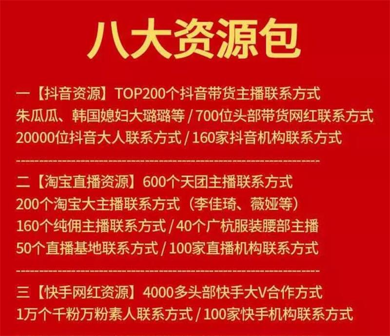 互联网八大资源包:含抖音主播资源,淘宝直播资源,快收网红资源,小红书资源等,资源比较全,尽快获取资源,为你的工作或者项目能创造最大价值才是最重要的。八大资源包具体内容:一、【抖音主......
