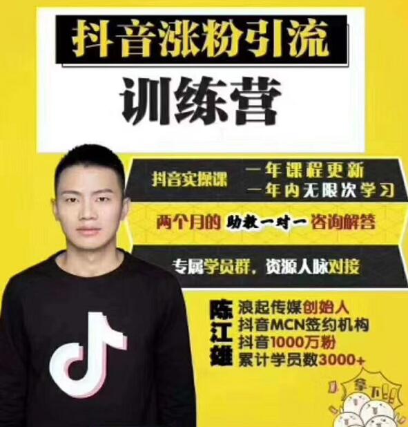 个人IP打造,账号定位包装,运营技巧,抖音矩阵,豆荚投放,直播间人气通通都有。做抖音的一定要看!抖音实操佣金月入破百万的陈江雄老师,为你准备好了小白到抖音高手全方位进阶课程,帮助你......