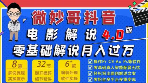 :微妙哥抖音电影解说4.0教程视频,零基础7天学会电影解说月入过万 培训课程视频讲座内容介绍:一、为什么要做电影解说?你在刷抖音的时候也许会觉得:那些解说大佬的声音非常好听,男性声......